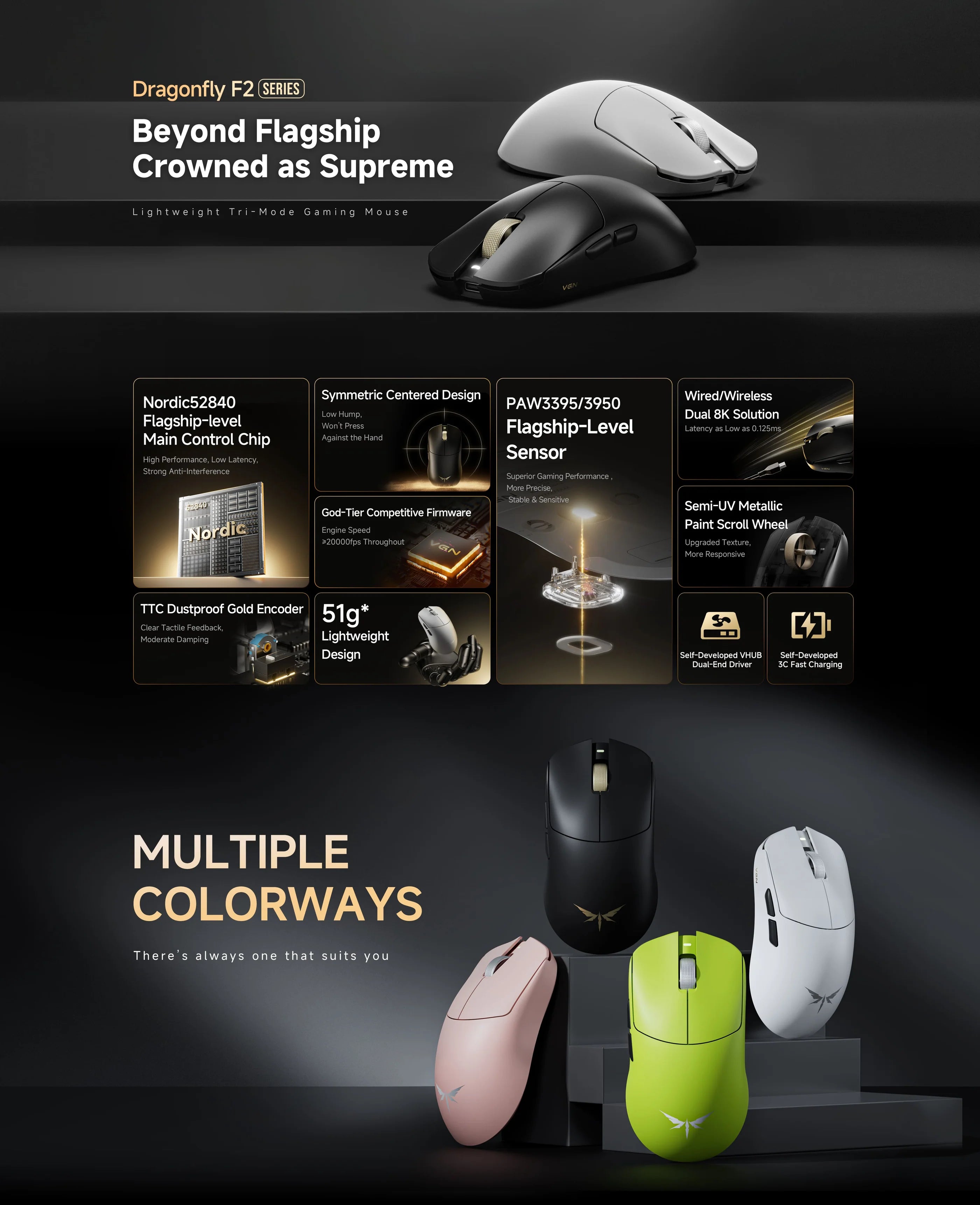 Faster, stabler clicks with fast response. Full self-developed wireless tech—custom e-sports transmission for Dragonfly series, ultra-low latency, smooth in multi-device environments, better gaming experience