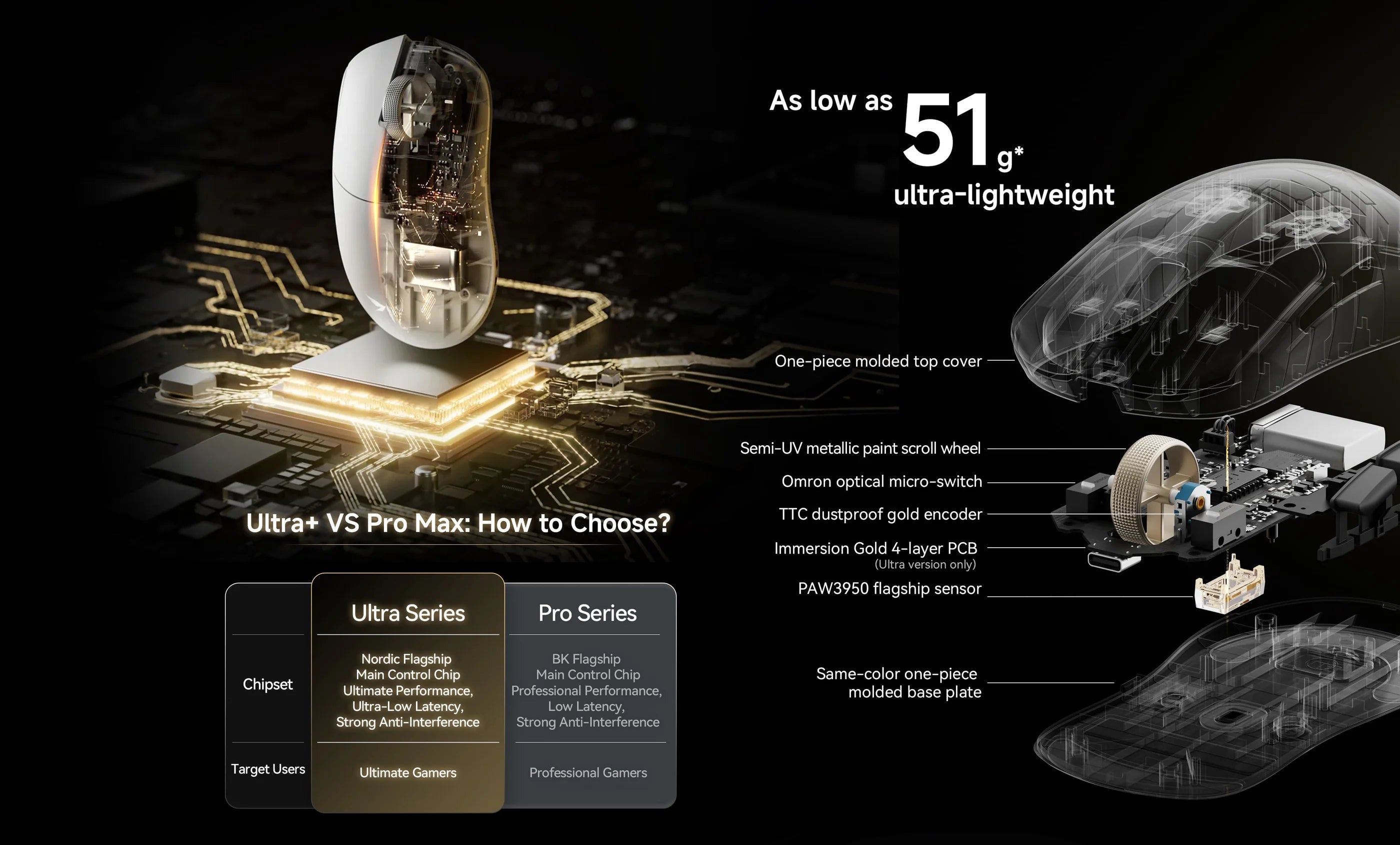 Ultra-lightweight down to 51g, equipped with Nordic flagship main control. Meet at the peak: ultra-low latency, stronger performance, lower power consumption, higher stability