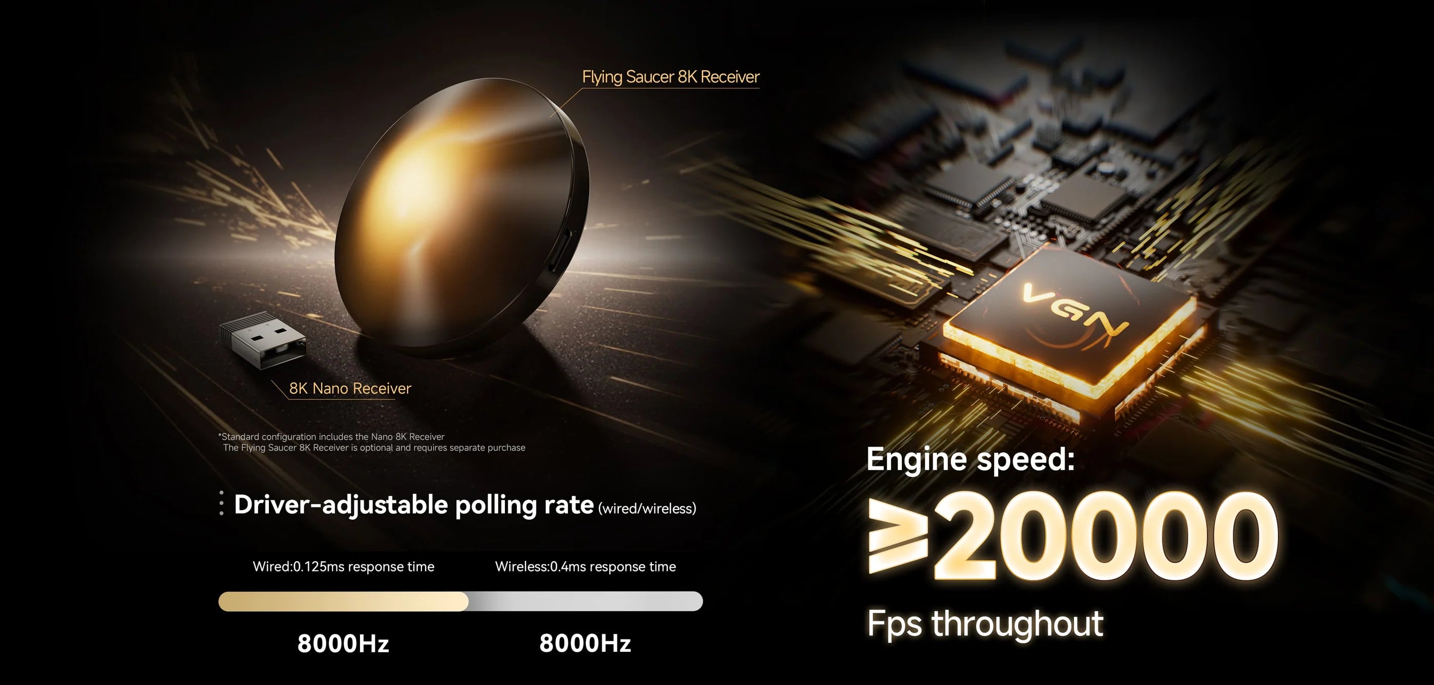 Supports wired/wireless dual 8K polling rate, standard 8K Nano receiver included, engine speed ≥20000 FPS. Fast response, smooth cursor, accurate positioning, stable performance, low latency